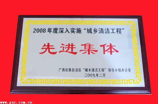 2009年2月廣西壯族自治區“城鄉清潔工程”領導小組辦公室授予我院“城鄉清潔工程”先進集體榮譽,其中我院職工王小浪、章開華被評為2008年度“城鄉清潔工程”先進個人。以資鼓勵。(備注:2007年11月至2008年11月我院代表廣西壯族自治區“城鄉清潔工程”領導小組辦公室赴梧州地區開展城鄉清潔督察工作,累計12次,圓滿完成了上級交付給我院的工作任務)