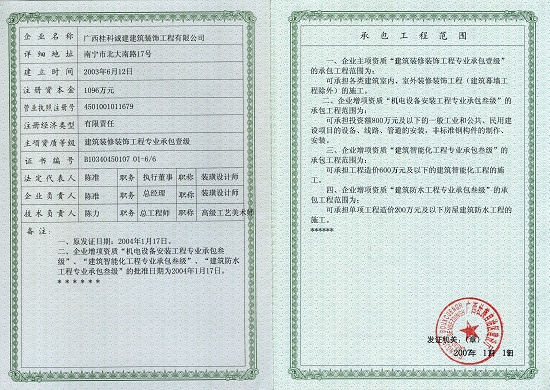 祝賀院控股公司桂科誠(chéng)建獲建筑裝修裝飾工程專業(yè)承包壹級(jí)