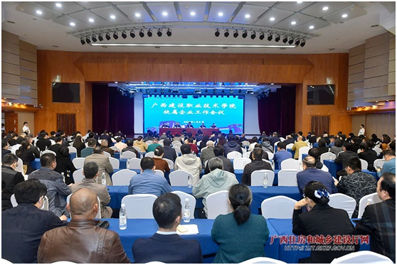 參會的自治區住房城鄉建設廳領導、廣西建設職業技術學院及校屬企業廣西建設職業技術學院建科資產經營有限公司、廣西建筑科學研究設計院、廣西城鄉規劃設計院、廣西城建咨詢設計有限公司班子成員合影。
