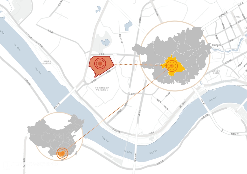 項目位于中堯路48號原南寧機械廠舊址,區(qū)位上毗鄰朝陽商圈,位于東西城市發(fā)展軸和邕江城市河流之間。場地周邊交通能級較高,利用TOD 軌交系統(tǒng)輻射城市大部分區(qū)域,半小時內(nèi)直達新老城區(qū)核心商務圈,影響力較大。項目用地面積約 221 畝,總建筑面積約 9.95 萬平方米。
