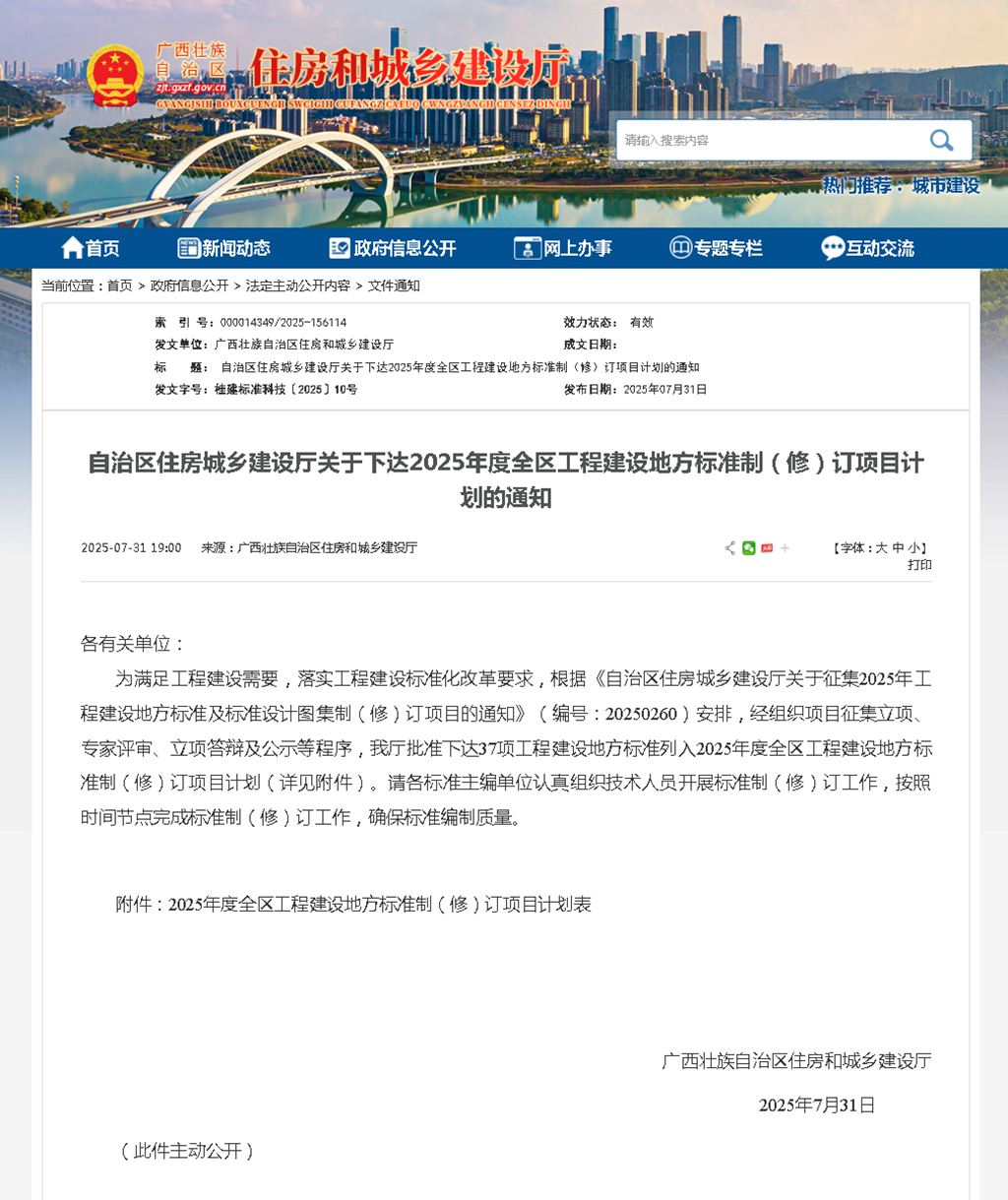 近日,自治區住房城鄉建設廳印發《關于下達2025年度全區工程建設地方標準制(修)訂項目計劃的通知》,公布了本年度工程建設地方標準編制計劃。其中,由我院主編或參編的《好社區技術導則》《建設工程消防驗收現場評定技術規程》以及《廣西數字家庭建設評價標準》等12項標準成功入選。這一重要成果標志著我院在工程建設標準化領域的專業能力與技術水平再獲行業認可。