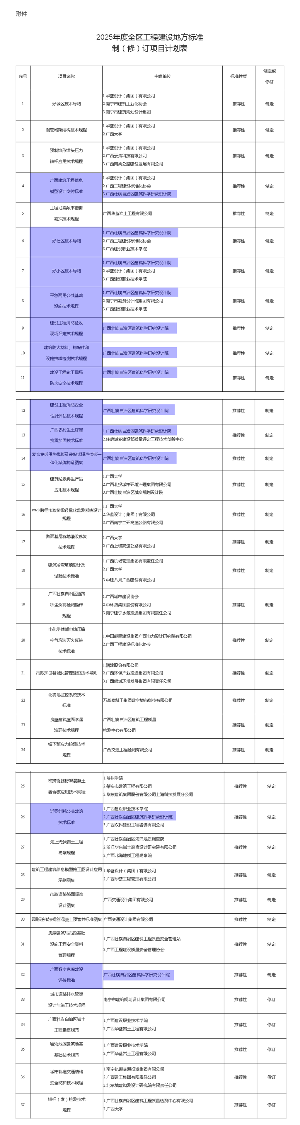 近年來,我院高度重視標準化建設工作,依托“住房城鄉建設部質量評定工程技術創新中心”“廣西綠色建筑與建筑節能技術創新中心”等科技創新平臺的深厚技術積累和研發優勢,組建專業團隊深耕標準研發及編制,已累計主導或參與編制地方標準、團體標準等各類標準百余項,這些標準在行業內發揮了重要的規范和引領作用。本次12項地方標準成功列入2025年計劃,既是對我院長期以來在標準化工作中所付出的努力和取得卓越成就的充分肯定,也是對我院技術實力、科研創新能力及行業貢獻度的高度贊譽。