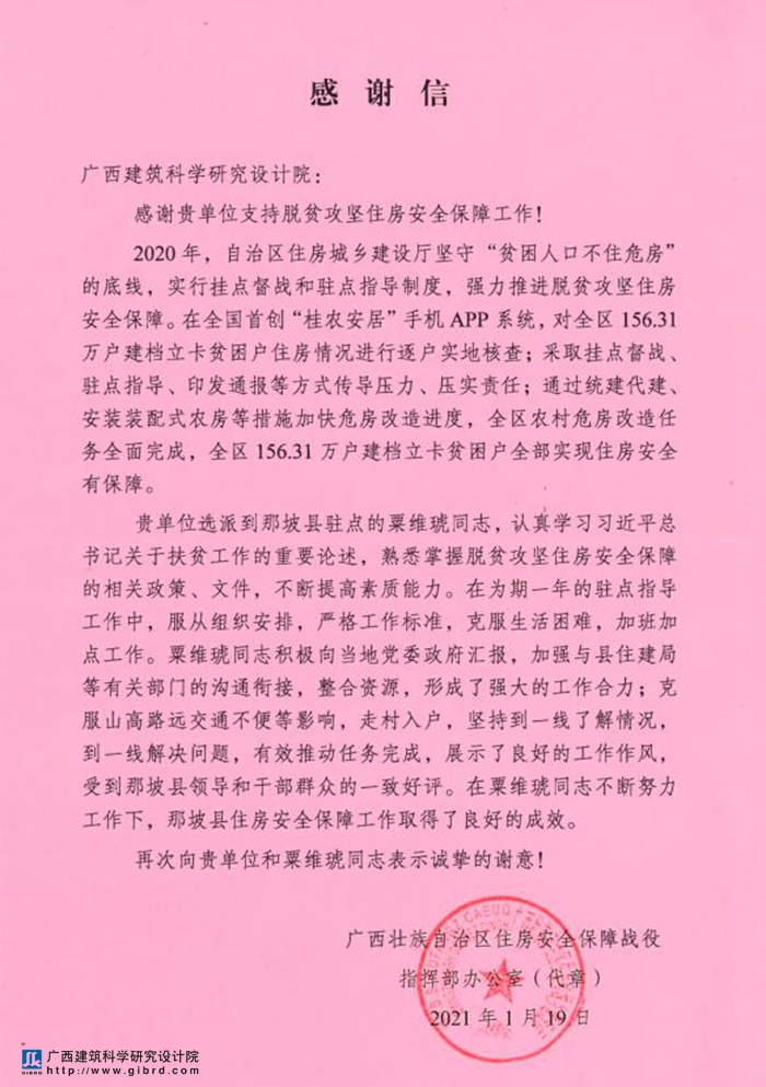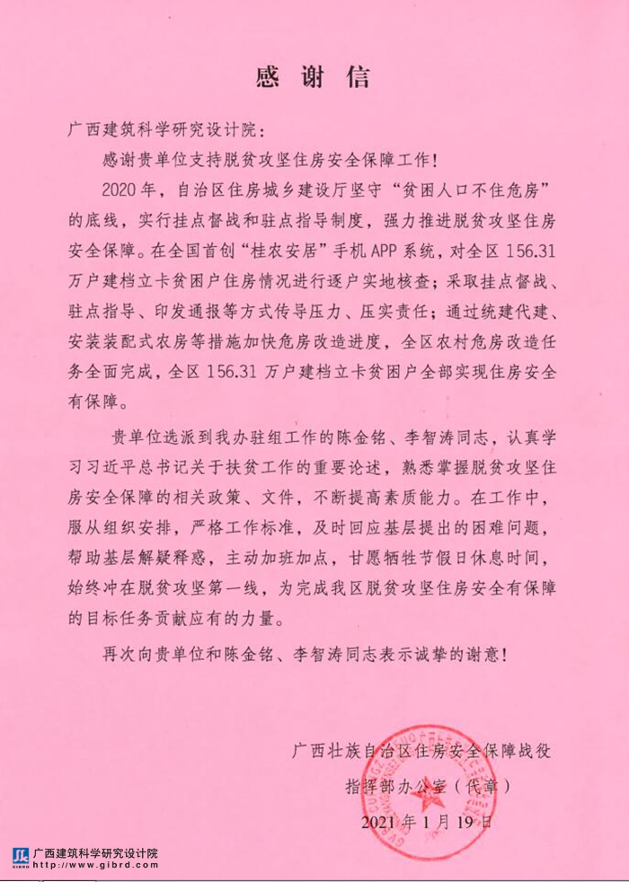 會上,劉哲處長介紹了到我院召開座談會目的,介紹了2020年全區鄉村風貌提升工作取得良好的成效,得到了住建部和自治區領導的高度肯定,自治區政協主席孫大偉,自治區黨委常委、自治區副主席黃世勇,自治區副主席周紅波等領導先后蒞臨自治區鄉村風貌提升三年行動指揮部調研指導。感謝我院積極主動大力配合和支持村鎮建設處開展脫貧攻堅住房安全有保障、鄉村風貌提升等工作,同時送來了對我院及我院選派到廣西壯族自治區鄉村風貌提升三年行動指揮部辦公室駐組工作的金逸鮮、陳勍、盧山雄等同志的感謝信。
