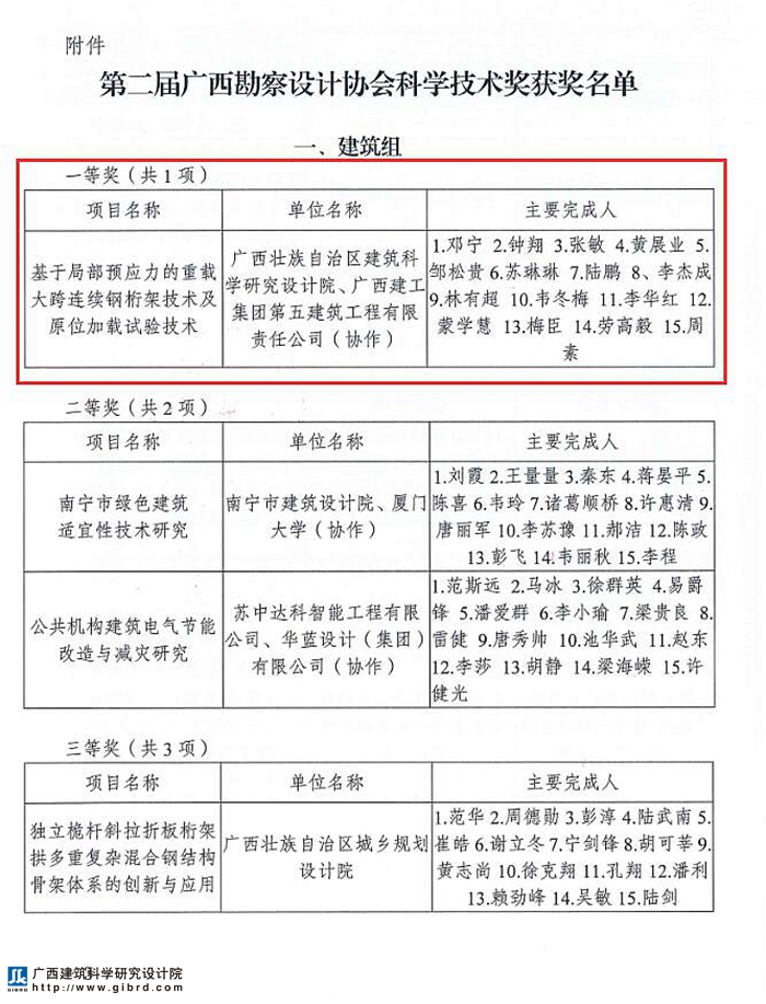 近日廣西勘察技術協會公布了第二屆廣西勘察技術協會科學技術獎評選結果,我院《基于局部預應力的重載大跨連續鋼桁架技術及原位加載試驗技術》項目榮獲一等獎、《廣西夏熱冬暖地區立體綠化應用研究》項目榮獲三等獎。
