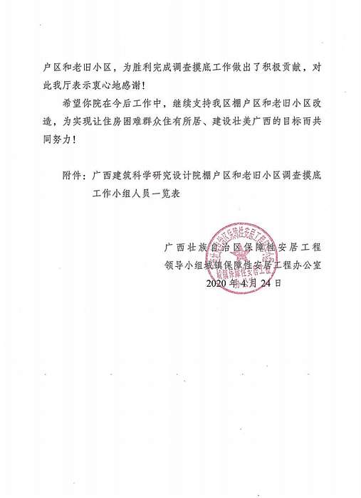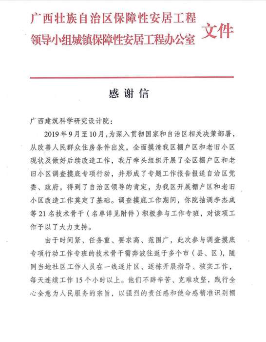 2019年9月至10月,我院選派李杰成副院長等21名技術骨干積極參與自治區住建廳工作專班,全面摸清全區棚戶區和老舊小區現狀及做好后續改造工作。我院技術骨干每天工作15個小時以上,不辭辛苦、克難攻堅,踐行全心全意為人民服務宗旨,以強烈的責任感和使命感精準識別棚戶區和老舊小區,為勝利完成調查摸底工作做出了積極貢獻,得到自治區住建廳的表揚和感謝。