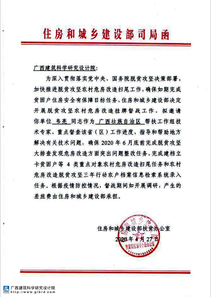 2020年4月27日,住房和城鄉(xiāng)建設(shè)部扶貧辦公室發(fā)文邀請我院副總工程師韋亮同志作為廣西壯族自治區(qū)幫扶工作組技術(shù)專家,重點(diǎn)督查廣西脫貧攻堅(jiān)農(nóng)村危房改造工作進(jìn)度,指導(dǎo)和幫助地方解決有關(guān)技術(shù)問題。這不僅是韋亮同志個(gè)人的榮譽(yù),也是我院的榮譽(yù)。