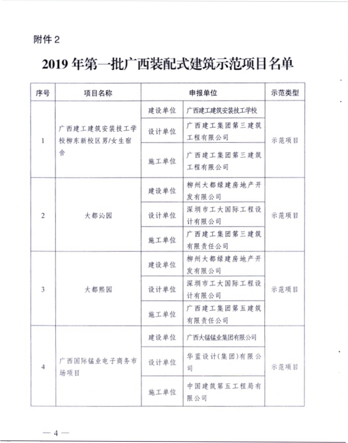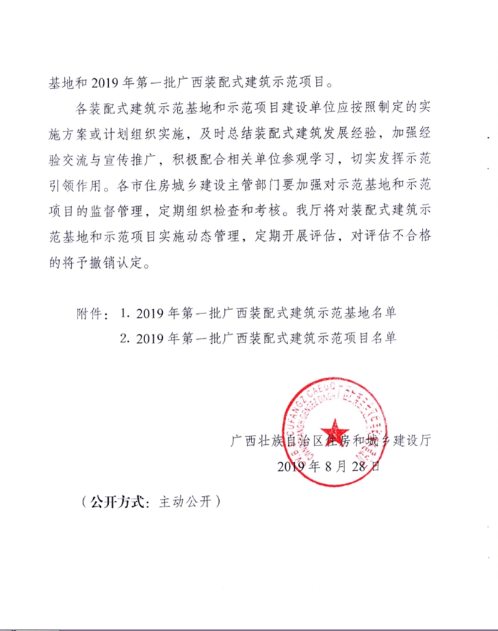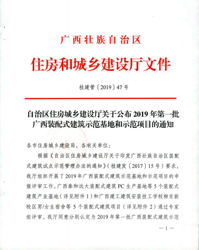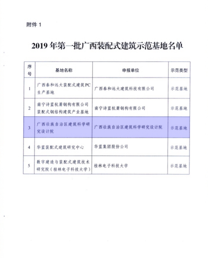2019年8月29日,自治區(qū)住建廳印發(fā)了《自治區(qū)住房城鄉(xiāng)建設(shè)廳關(guān)于公布2019年第一批廣西裝配式建筑示范基地和示范項(xiàng)目的通知》(桂建管〔2019〕47號(hào))文件,我院被認(rèn)定為2019年第一批廣西裝配式建筑示范基地。