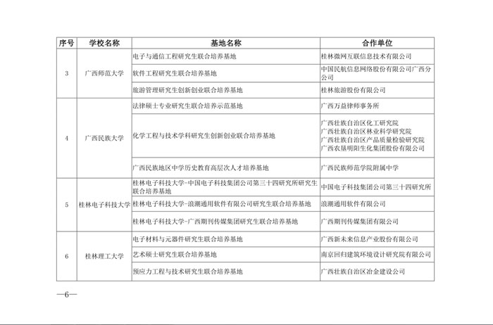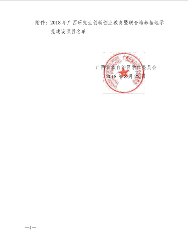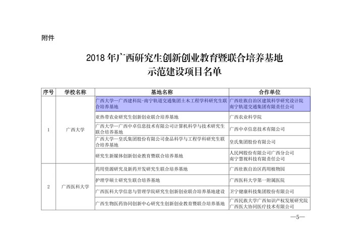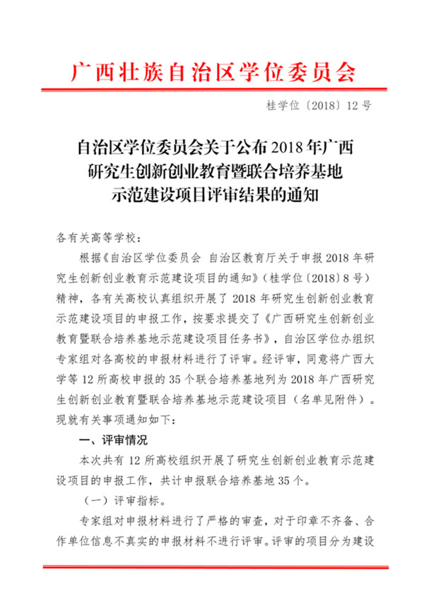 根據《自治區學位委員會 自治區教育廳關于申報2018 年研究生創新創業教育示范建設項目的通知》(桂學位〔2018〕8 號)精神,自治區各有關高校認真組織開展了2018 年研究生創新創業教育示范建設項目的申報工作。2018年8月,自治區學位委員會印發桂學位〔2018〕12號公布評審結果,由我院與廣西大學、南寧軌道交通集團共同建設的“廣西大學—廣西建科院-南寧軌道交通集團土木工程學科研究生聯合培養基地”被評為2018年廣西研究生創新創業教育暨聯合培養基地示范建設項目。