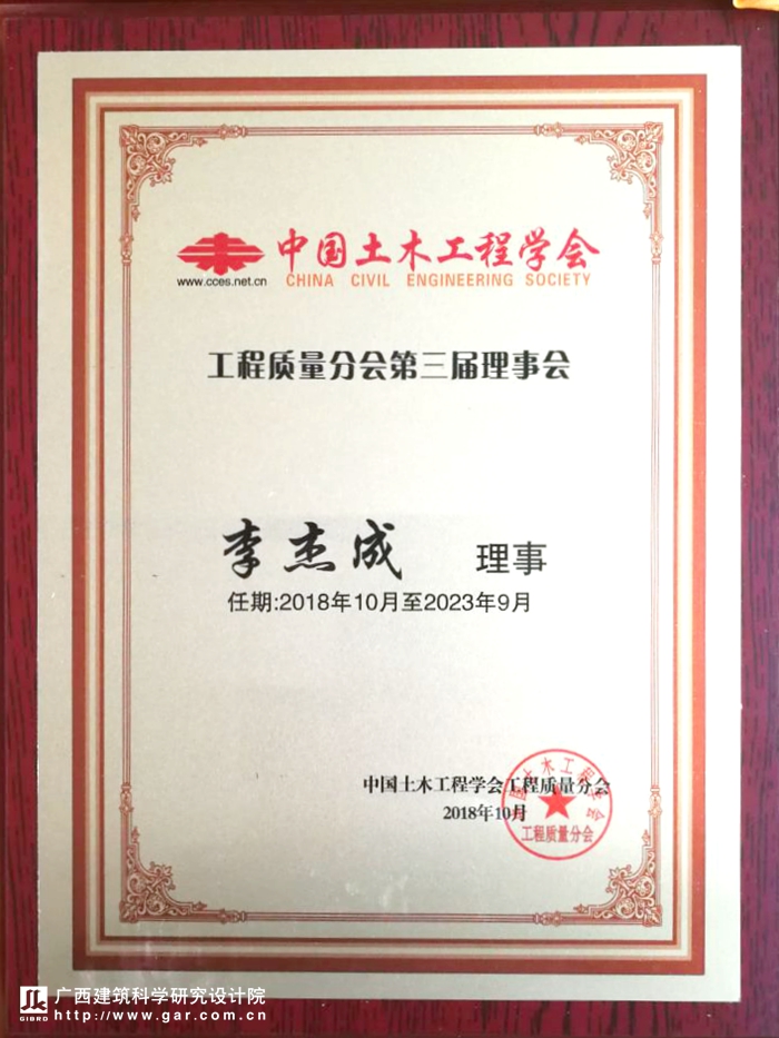 2018年10月16日,中國土木工程學會工程質量分會在福州舉行了第三屆理事會換屆會議。我院副院長、廣西工程勘察設計大師、李杰成教授級高工當選為中國土木工程學會工程質量分會第三屆理事會理事。