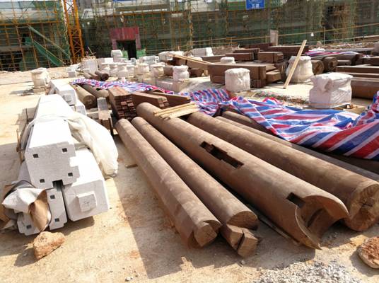 工廠生產(chǎn)的裝配式木石構(gòu)件準(zhǔn)備吊裝