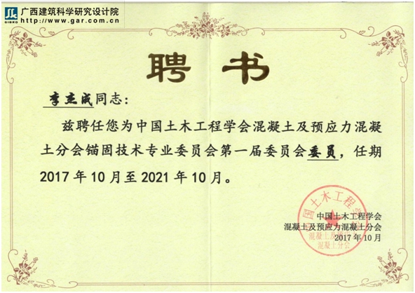 為適應和推動我國鋼筋混凝土結構錨固技術的發展,經中國土木工程學會混凝土及預應力混凝土分會批準,“中國土木工程學會混凝土及預應力混凝土分會錨固專業委員會”第一屆委員會于2017年10月27日在杭州正式成立,第一屆委員會通過推薦和選舉產生了專業委員會正副主任委員和秘書長。廣西工程勘察設計大師、院副總工程師李杰成教授級高工被聘為中國土木工程學會錨固專業委員會第一屆委員會委員。