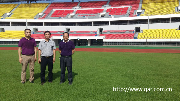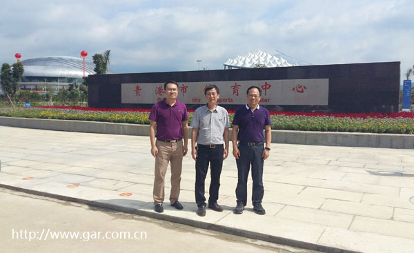 黃晨院長、龐耀國副院長和李杰成副總工程師在貴港體育中心的合影