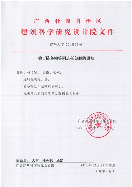 各所、科(室)、分院、公司: 經(jīng)研究決定,聘: 陳冬梅任市政分院副院長。 免去彭漢明同志市政分院副院長職務(wù)。