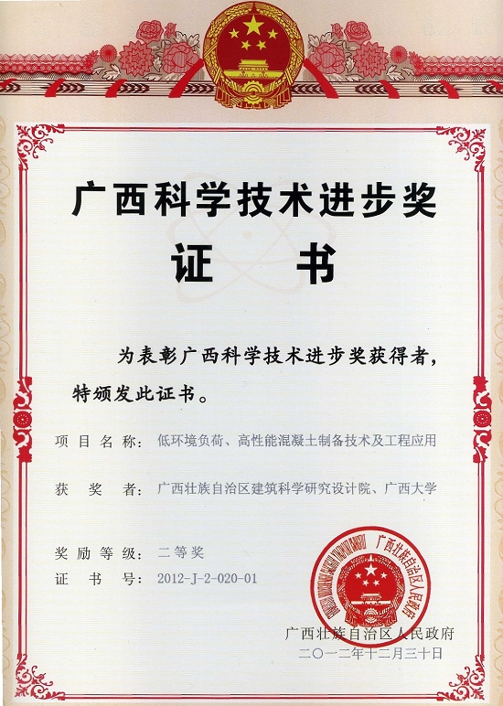 2013年1月9日,在廣西人民政府召開的2012年度廣西科技表彰獎(jiǎng)勵(lì)大會(huì)上,我院科研成果“低環(huán)境負(fù)荷、高性能混凝土制備技術(shù)及工程應(yīng)用”榮獲科技進(jìn)步二等獎(jiǎng),“基于廣西氣候特征的居住建筑節(jié)能技術(shù)創(chuàng)新與集成示范”、“房屋建筑大跨度預(yù)應(yīng)力混凝土梁板關(guān)鍵技術(shù)研究及應(yīng)用”兩項(xiàng)目榮獲2012年度廣西科學(xué)技術(shù)進(jìn)步三等獎(jiǎng)。我院朱惠英副院長代表我院出席了大會(huì)。
