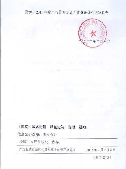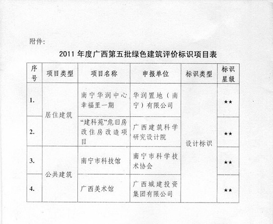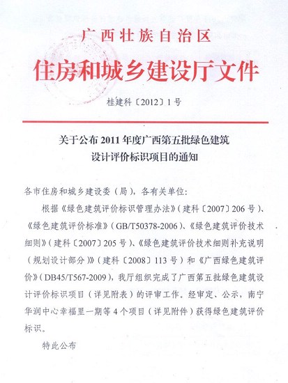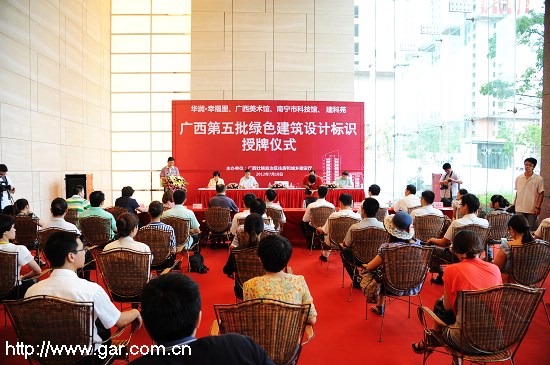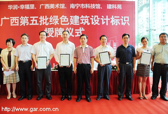 2012年7月18日,廣西第五批綠色建筑設計標識授牌儀式在南寧舉行。自治區住房和城鄉建設廳向獲得綠色建筑設計評價標識證書的華潤幸福里、廣西美術館、南寧市科技館和我院危舊房改住房改造項目“建科苑”頒發了證書。