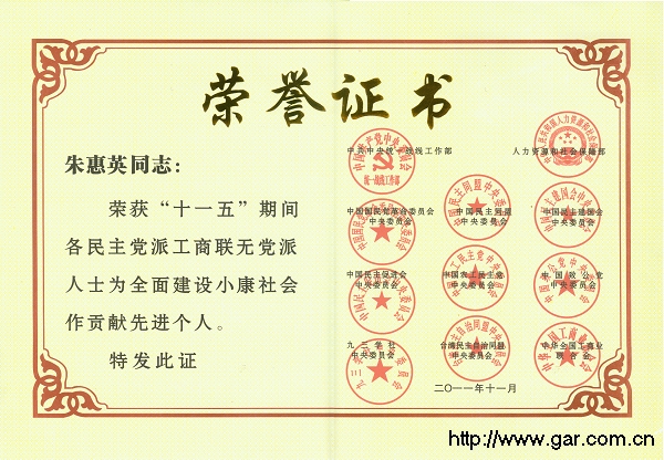 朱惠英副院長(zhǎng)榮獲“‘十一五’期間各民主黨派、工商聯(lián)、無(wú)黨派人士為全面建設(shè)小康社會(huì)做貢獻(xiàn)先進(jìn)個(gè)人”榮譽(yù)稱(chēng)號(hào) 獎(jiǎng)狀