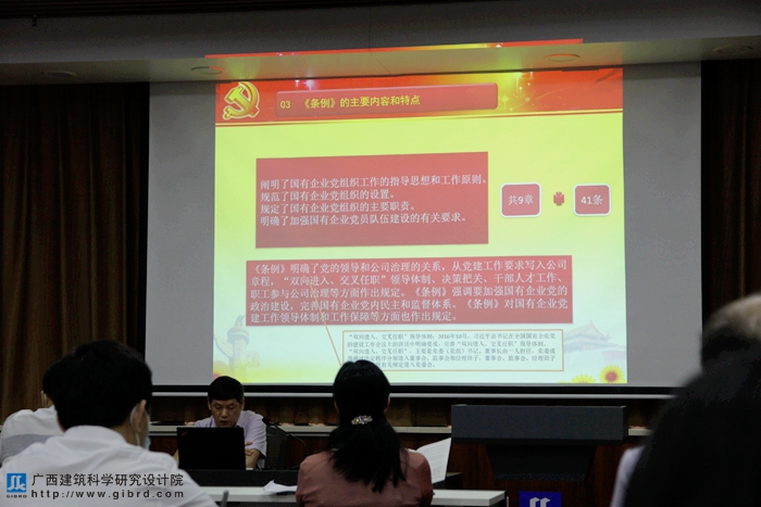 此次黨課由院黨委書記俸尚東主持授課。俸書記指出,《條例》以習近平新時代中國特色社會主義思想為指導,對國有企業黨組織工作作出全面規范,是新時代加強國有企業黨的建設的基本遵循,對加強國企黨建工作具有很強的指導作用;要求全員要深入領會《條例》精神,堅持黨對國有企業的領導不動搖,把國有企業黨的建設作為管黨治黨的重要任務抓緊抓好,強化責任落實,把黨對國有企業的全面領導落到實處、見到實效,把強化黨建與公司經營管理相融合,以高質量黨建工作推動企業各項生產經營任務落實,助力企業改革發展。